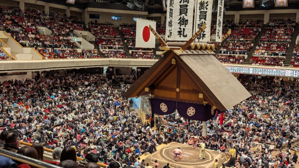 九日目の国技館の取組みはいつも通り午前9時20分に序の口より始まりますが、10時半に色とりどりののぼり旗が靡く正門から入り、国技館の館内を30分ほどぐるっと見学、お気に入りの横綱弁当とビールを買って2階イスB席のある向4扉から入り向10列41番の席に陣取りました。